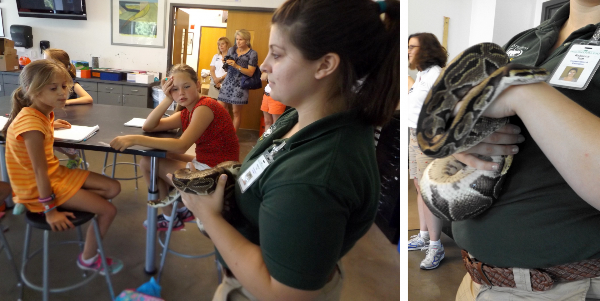 They were visited by each animal class throughout the week with the exception of primates. This afternoon, campers got to meet a Legless Lizard, a Prehensile Tailed Skink (below left), and an African Ball Python (above). Campers loved learning about all of the different kinds of creatures!