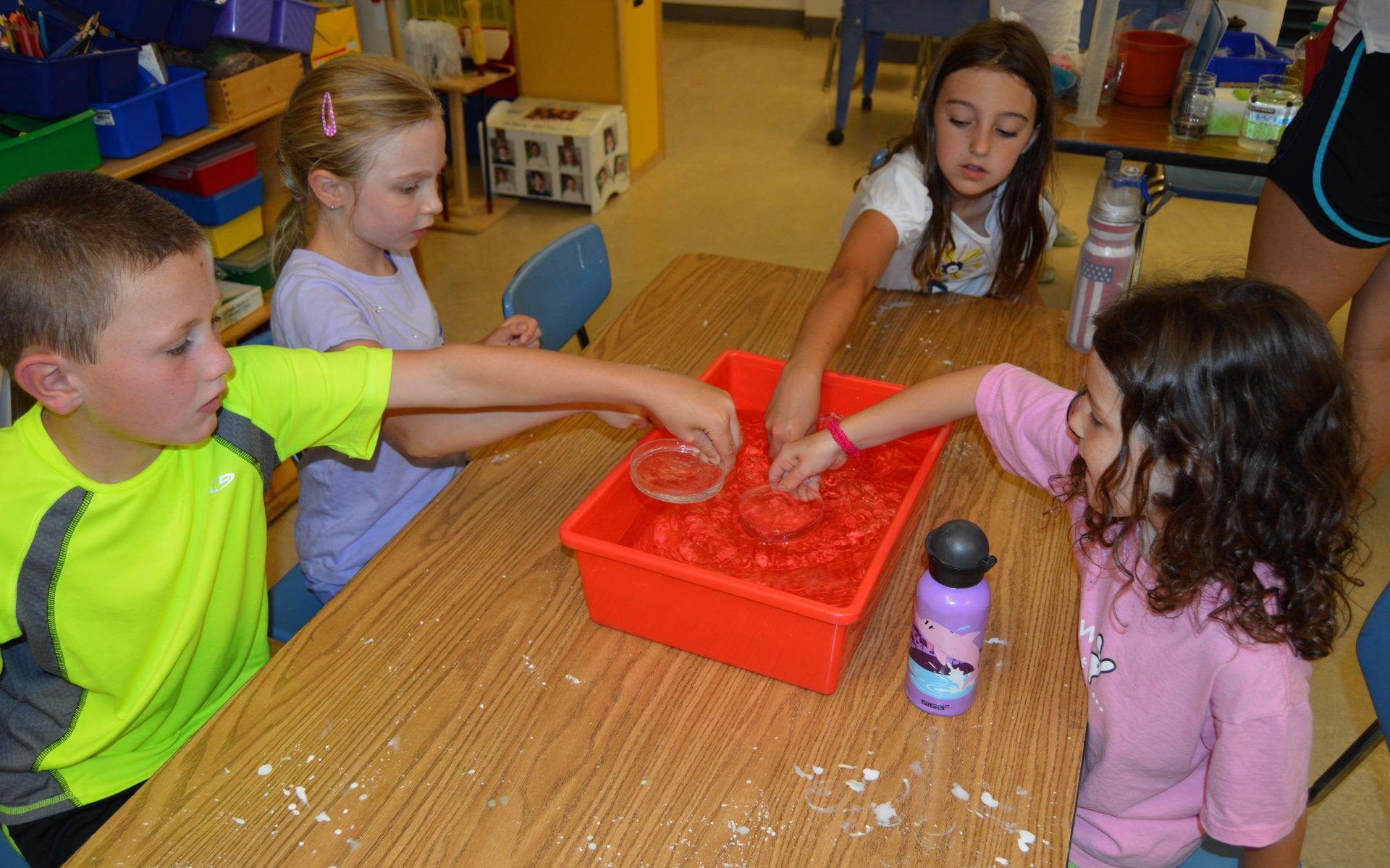 Little scientists fill petri dishes for an experiment.