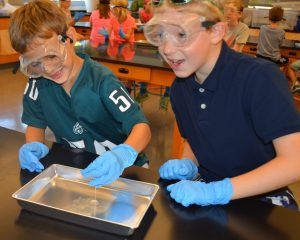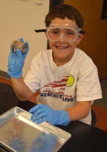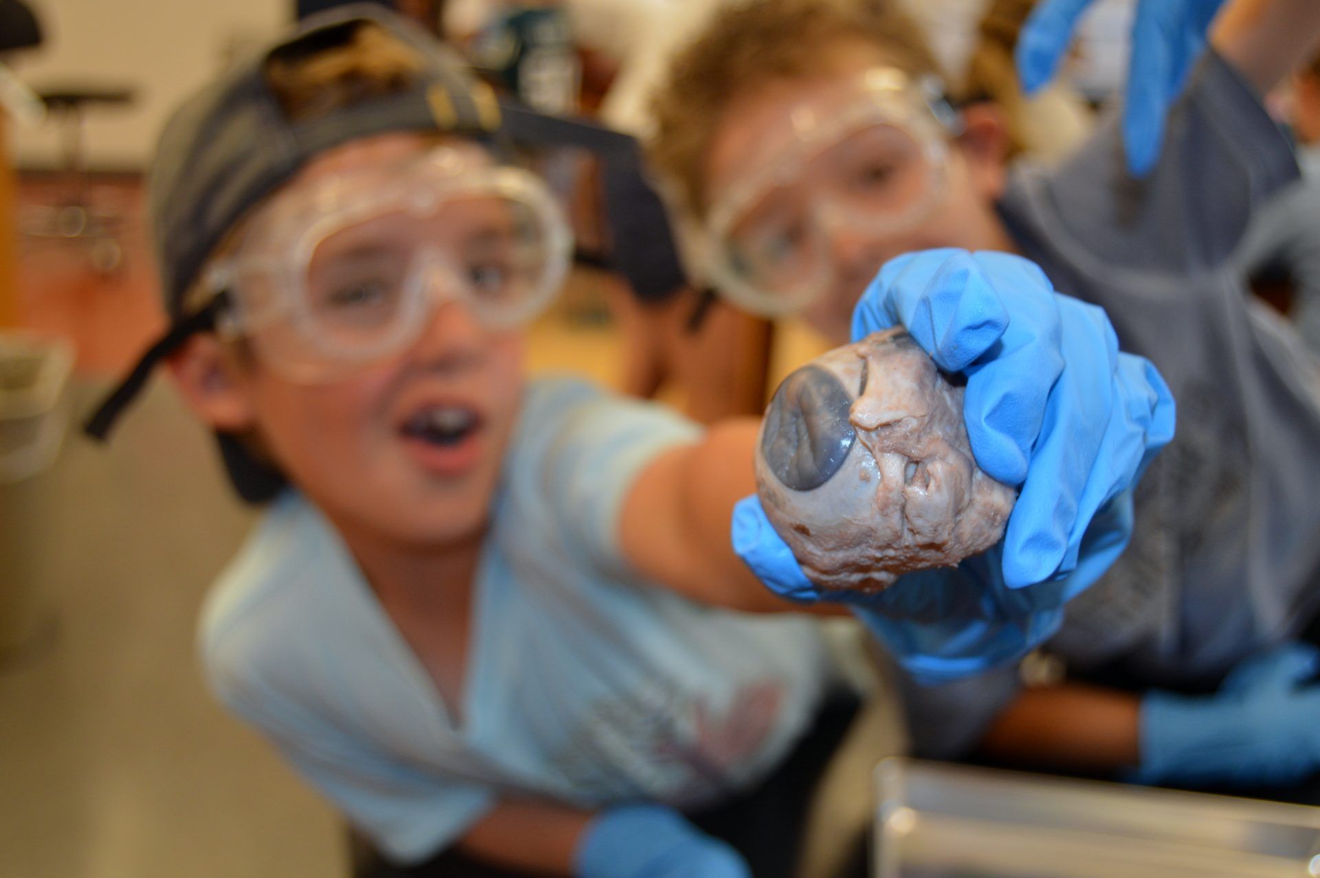 They started the morning with a pair of rubber gloves and a box full of preserved cows’ eyes. Campers paired up and were given eyes to dissect, but they seemed to spend more time comparing the cow’s eye to their own eyeballs! The eyes were rubbery to touch and still had fluids inside, which campers really enjoyed squeezing out.