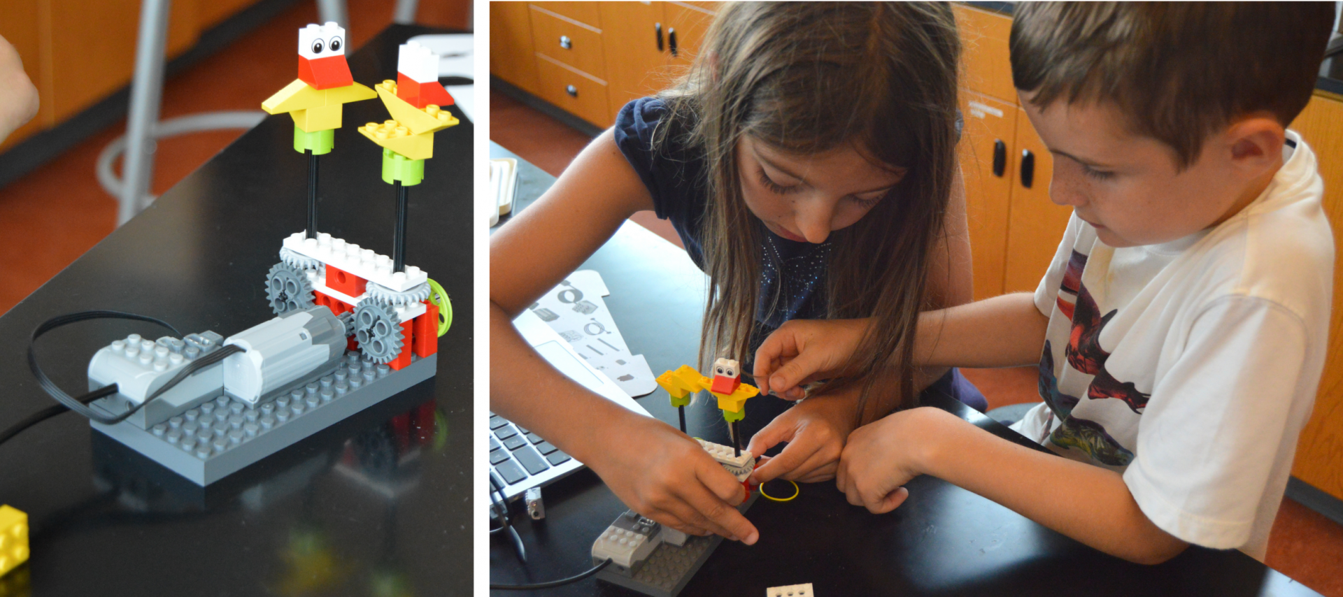 The Junior Robotics course is back for another go-around within the Center for Growth and Innovation (CGI) at ESF. This time, campers are learning how to program their wheels and gears along with sounds, too. This morning, they paired up and built ‘Walking Ducks’ that twisted and turned as they walked along the desks and even quacked on command.