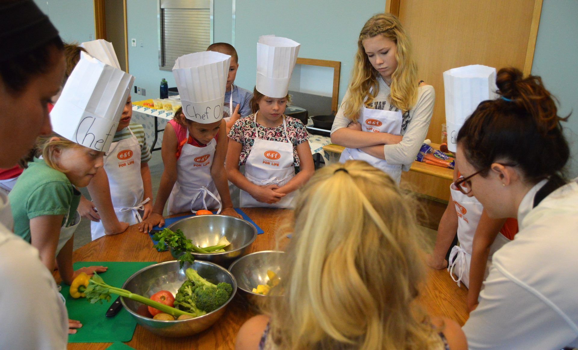 Junior chefs look-on as Chef Amy teaches proper knife skills.