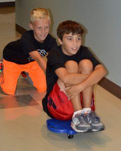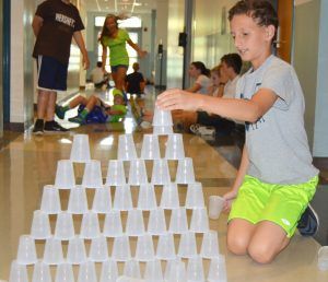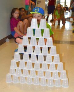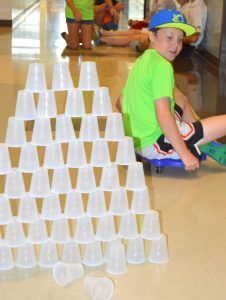 One of today’s challenges was to build a human bowling pin set using only 50 plastic cupsĀ that could withstand a rolling camper on a seated scooter. The group that built a pin-set that surrendered the least amount of fallen cups when the camper ran into them was deemed the winner. Campers built up their cups in all sorts of shapes, depths, and sizes until they figured out the perfect solutions.
