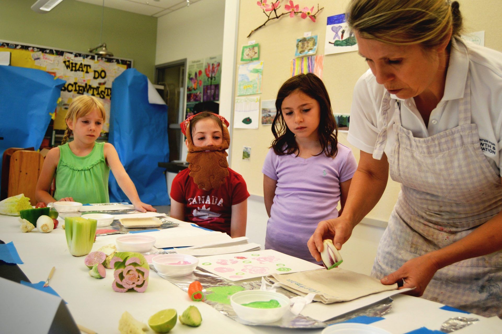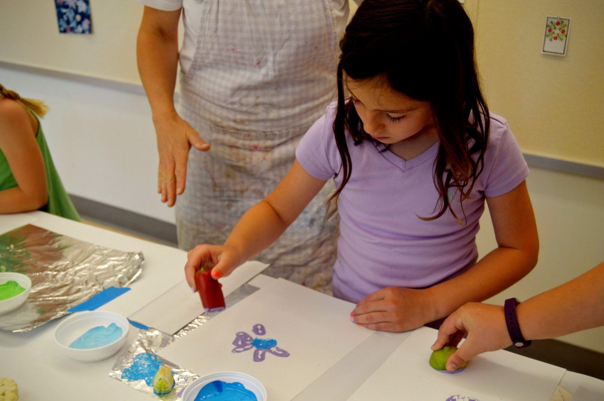 Today, they thought outside the box and used various fruits and vegetables in lieu of paint brushes. Ms. Hartman helped the campers to use their imaginations as they used peppers as petals and citrus fruits as suns. The campers created some outstanding artwork!