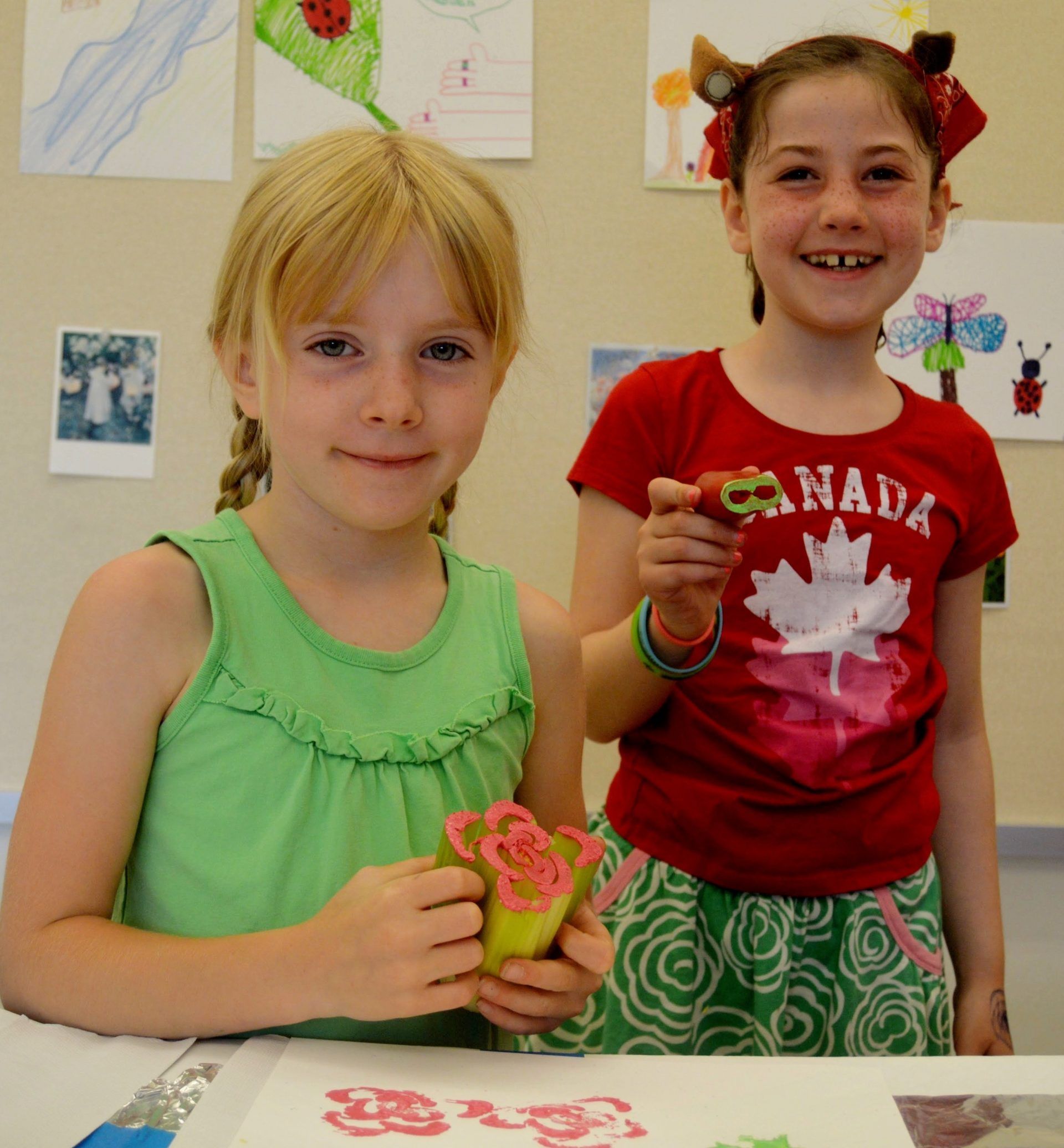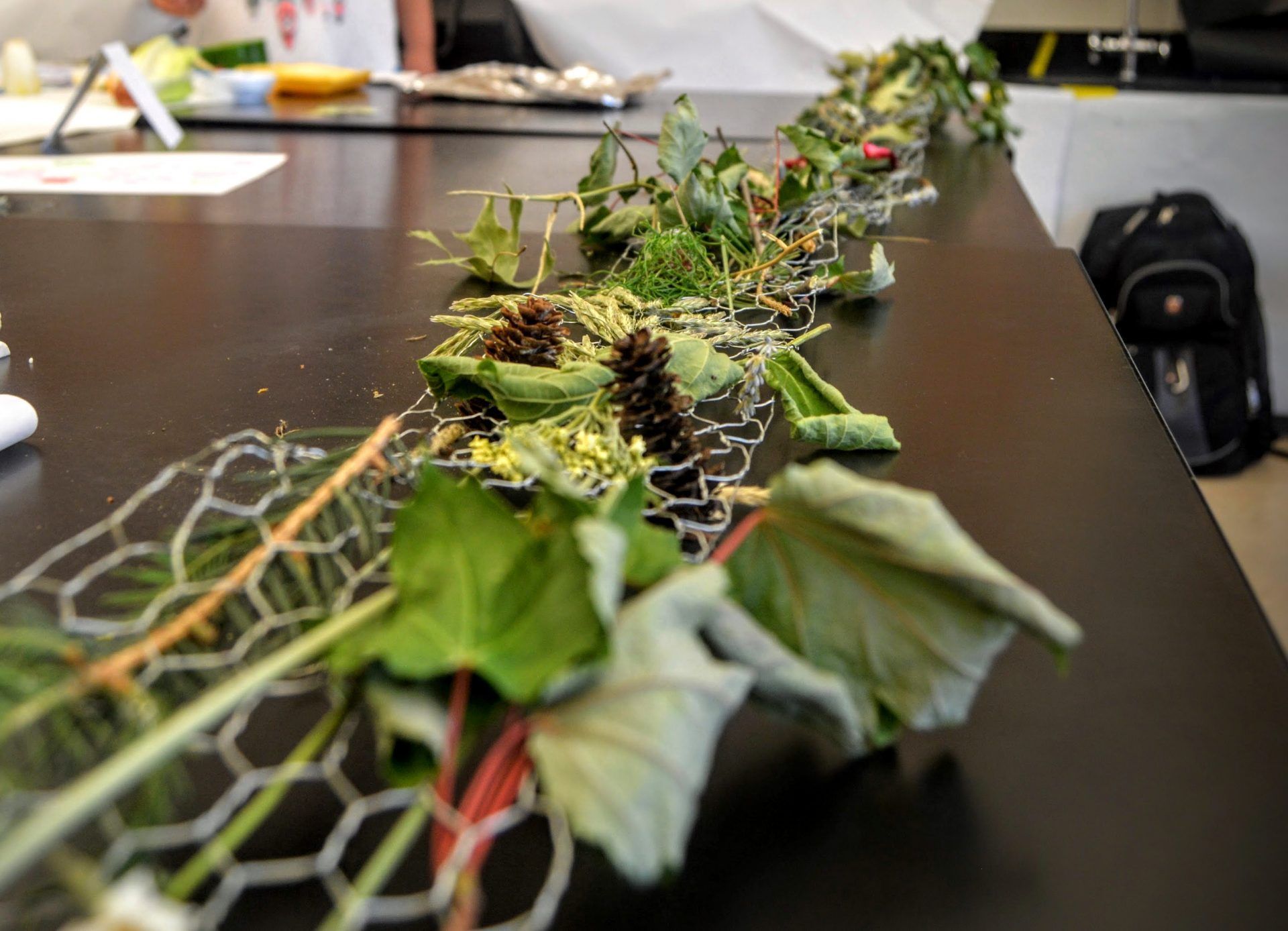 At Art and Nature, campers fuse the great outdoors with imagination to create art using resources from the world around us. The nature mural in the classroom continues to grow from the first items they gathered on their nature walk on Monday. The campers have brought in flowers, leaves, and twigs from home to contribute to the long mural. This week, the campers have also worked on flower presses and painted sticks to create wands.