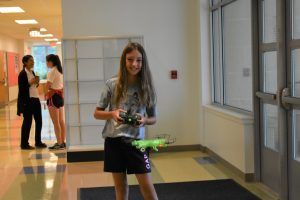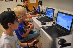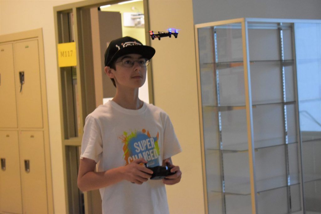 According to their instructor Eric Chesloff, the program is very challenging and it prepares them to fly the drones by learning to control flight as well as how to take off and land the aircraft. There was definitely a learning curve to the program but the campers enjoyed using the simulator. The campers flew their drones inside and attempted tricks like flips in midair and maneuvering around and under chairs as they slowly mastered the controls.
